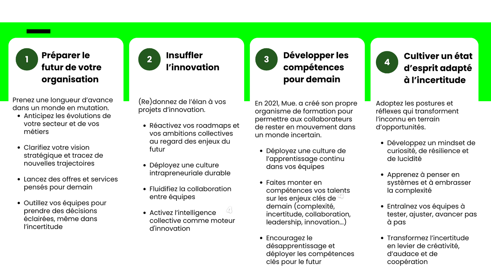Mue. est un organisme de formation, dédié aux compétences pour les adresser.